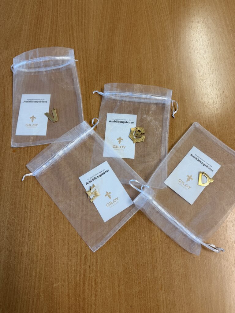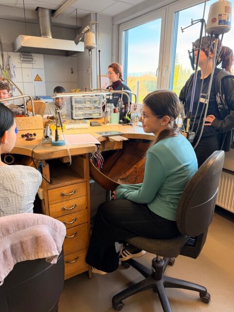 Zu Beginn durften die Jugendlichen eigene Skizzen anfertigen: Der Anfangsbuchstabe ihres Vornamens sollte später als kleines Schmuckstück aus Messing gestaltet werden. Unter Anleitung der Ausbilderinnen entstanden erste Entwürfe, die anschließend in der Goldschmiedewerkstatt umgesetzt wurden. Mit Unterstützung der Auszubildenden arbeiteten die Schülerinnen und Schüler selbstständig an der Werkbank und fertigten Schritt für Schritt ihr persönliches Schmuckstück an – ein besonderes Erlebnis, das handwerkliches Geschick und Kreativität vereinte.