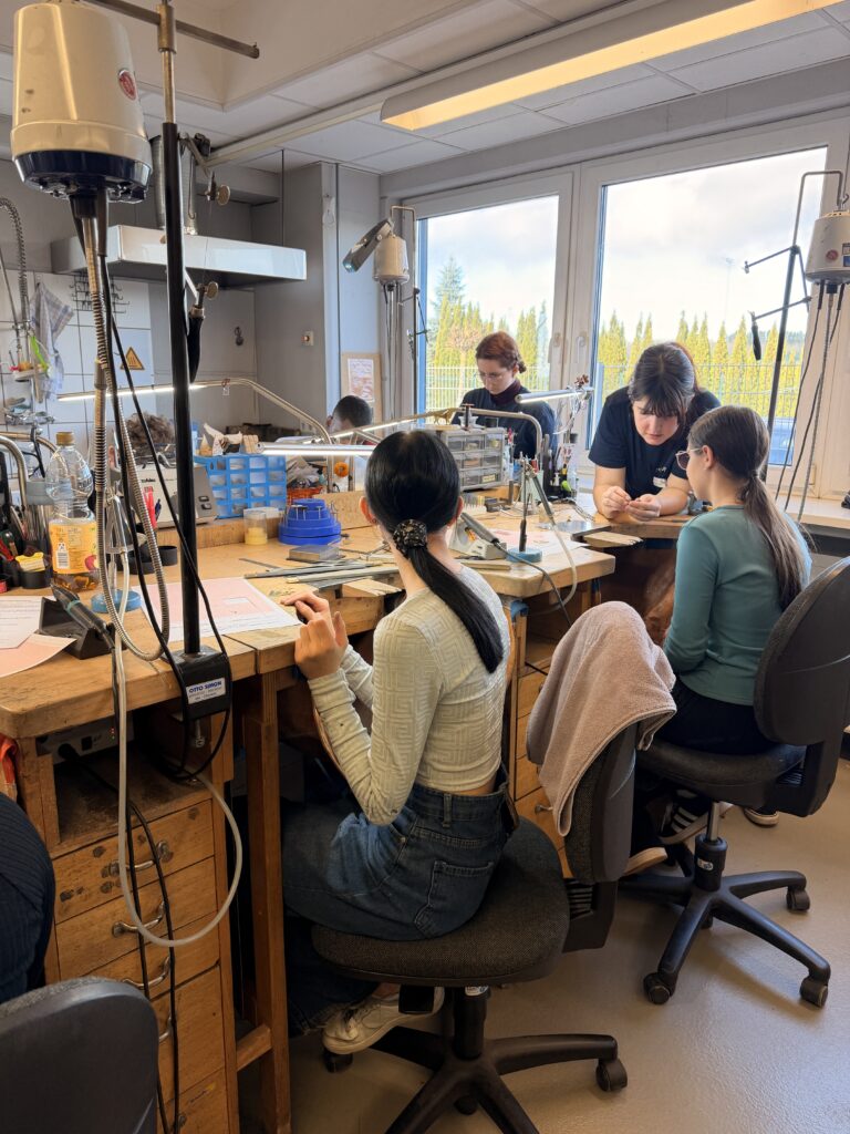 Im Anschluss erhielten sie eine ausführliche Werkführung. Dabei lernten sie die vielen Stationen der Schmuckherstellung kennen: vom ersten Design über den hochpräzisen 3D-Druck bis hin zur finalen handwerklichen Ausarbeitung mit Farbsteinen oder Diamanten. Die Vielfalt und Komplexität der einzelnen Arbeitsschritte beeindruckte die Gruppe nachhaltig.